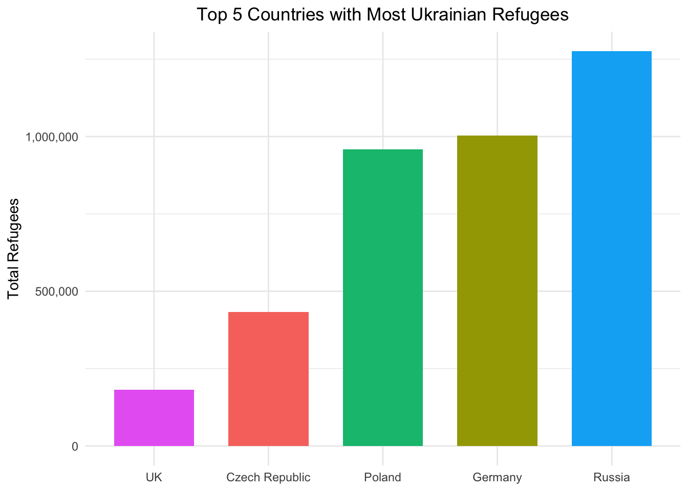 This bar chart displays the top 5 countries hosting the most Ukrainian refugees (since the beginning of the full-scale invasion).The y-axis represents the total number of refugees, with Russia hosting the highest number, exceeding a million. Germany and Poland follow closely with almost a million refugees each, while the Czech Republic has just under 500,000. The UK has the fewest refugees among the five countries, with less than 250,000.