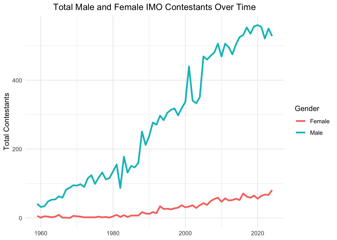 This plot shows the total number of male and female contestants in the International Mathematical Olympiad (IMO) over time, from the 1950s to the 2020s. The blue line represents the number of male participants, and the red line represents the number of female participants.